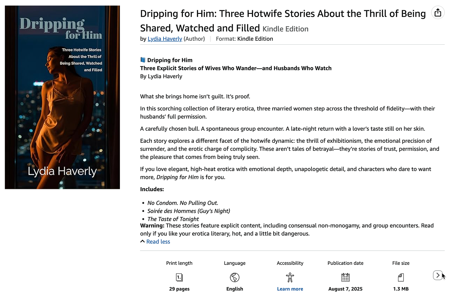 Later this week, I’ll publish Dripping for Him, my first Kindle ebook, as a collection of three high-heat hotwife stories that originally appeared here on Substack.