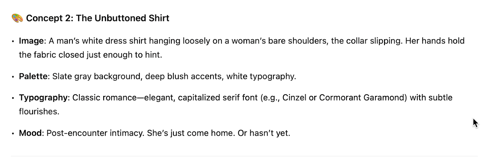 But before I started smashing the return button on a Whisk prompt, I asked GPT for five cover design options – and I picked the one closest to what I already had in mind (the sexy silhouette).