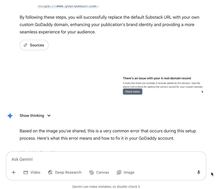 For instance: I’ve registered plenty of domains over the years, but I am no DNSexpert (lol, sorry). When I coughed up $50 for Substack’s custom domain feature to link LydiaHaverly.com to my site, I ran into a typical DNS headache. I screenshotted the error, sent it to Gemini, and was walked step-by-step through the fix.